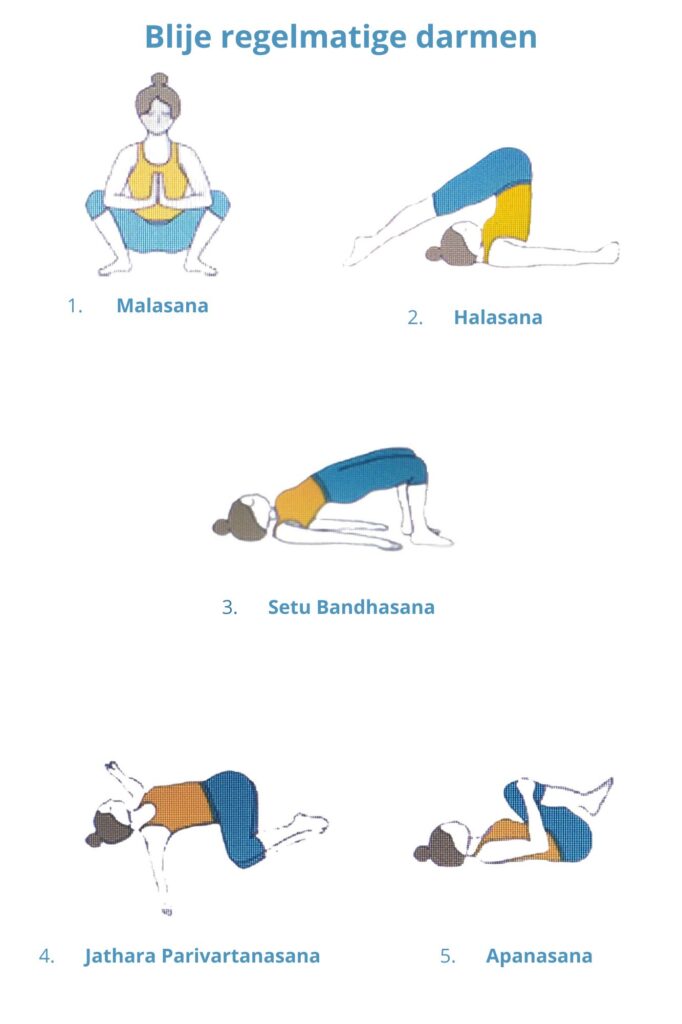 Om dit proces te vergemakkelijken kunnen we een specifieke reeks yogahoudingen doen. Deze reeks heb ik hier voor jou klaar. Het zijn vijf houdingen die je liefst vroeg in de ochtend en op een lege maag kan beoefenen. Deze stimuleren de peristaltiek van je darmen waardoor je drang krijgt en makkelijker naar de wc gaat. De houdingen die ik je voorstel werken op Apana Vayu. Dat is een neerwaartse en uitgaande energiestroom die aanwezig is in je bekken en in je lage buik. Deze energiestroom zorgt voor het verwijderen van alle soorten lichamelijke afval in de vorm van urine, menstruatie en stoelgang. Het is dus handig om deze Apana energiestroom sterk te houden.